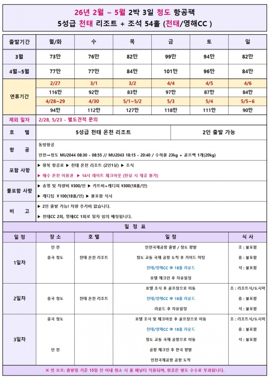 ·포함내역 왕복 항공권, 천태온천리조트숙박(2인1실), 조식, 그린피(18홀X3회), 해수온천 이용권, 레이트체크아웃, 여행자보험
