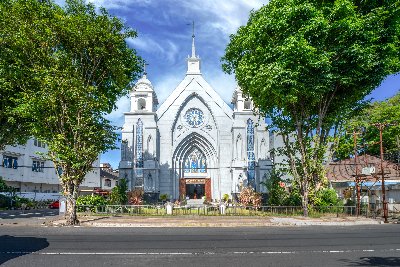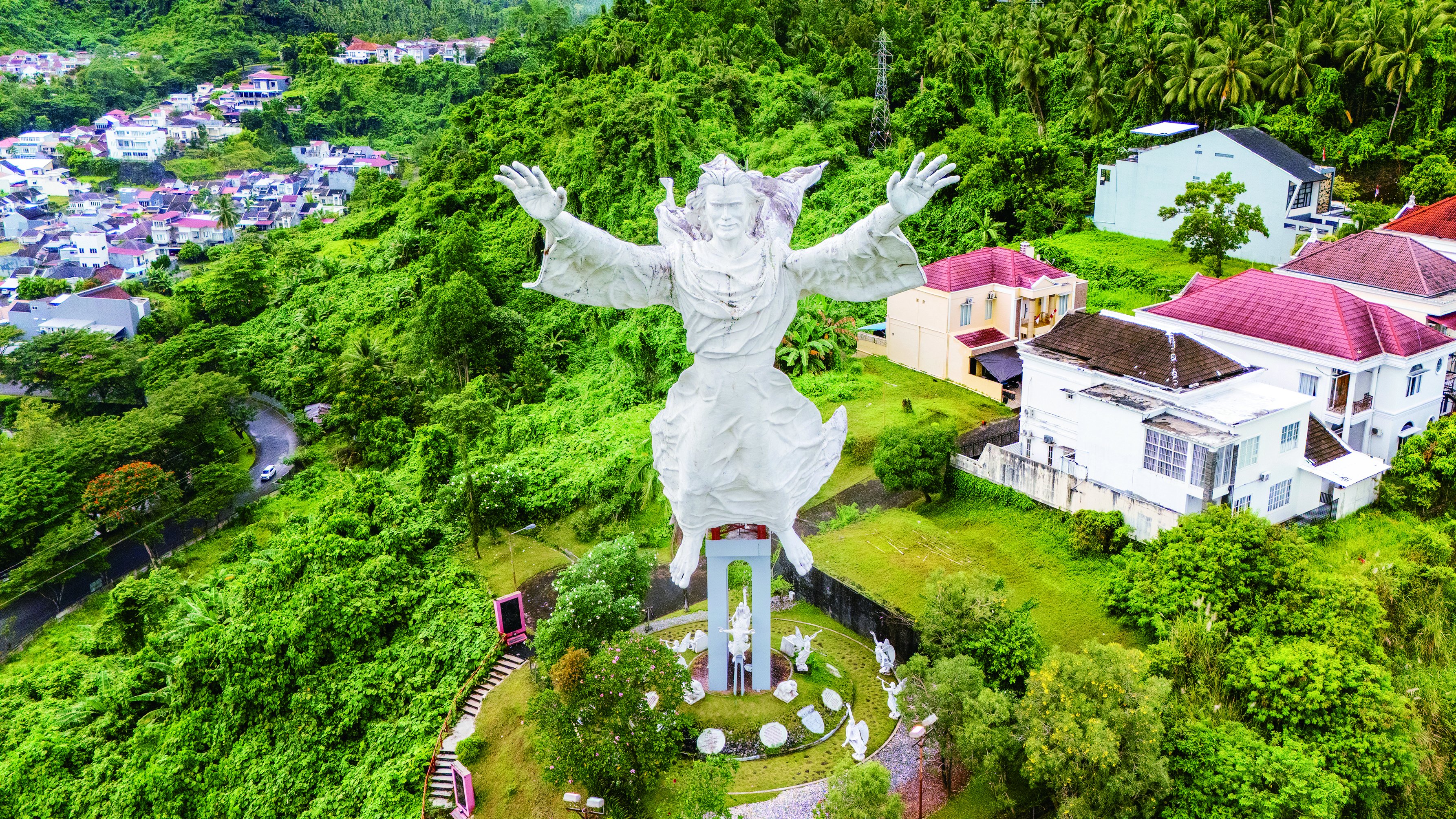 마나도 시내는 다양한 종교와 문화가 조화를 이루는 도시로, 주요 관광지로는 웅장한 마나도 대성당, 중국식 건축이 돋보이는 반힝키옹 사원, 역사 깊은 이슬람 사원, 그리고 현지인의 쉼터인 타만공원이 있습니다. 타만 공원을 중심으로 차이나타운과 아랍거리가 인접해 있어, 독특한 거리 풍경과 다채로운 현지 문화를 함께 체험할 수 있습니다. 각 명소는 도보로 둘러보기 좋으며, 마나도의 다문화적 정체성을 보여주는 대표적인 관광 코스로 손꼽힙니다. 축복하는 예수상