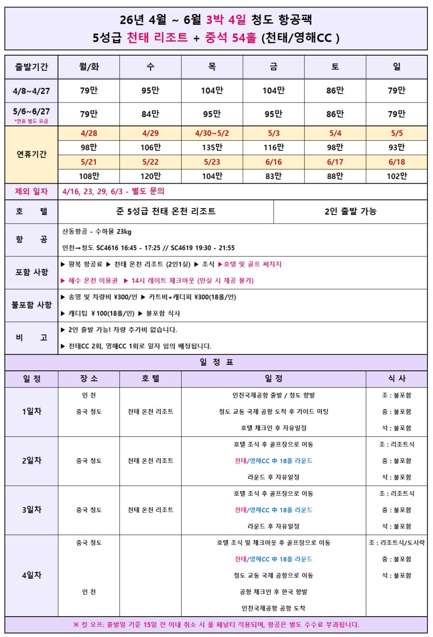 ·포함내역 왕복 항공권, 천태온천리조트숙박(2인1실), 조식, 그린피(18홀X3회), 해수온천 이용권, 레이트체크아웃, 여행자보험