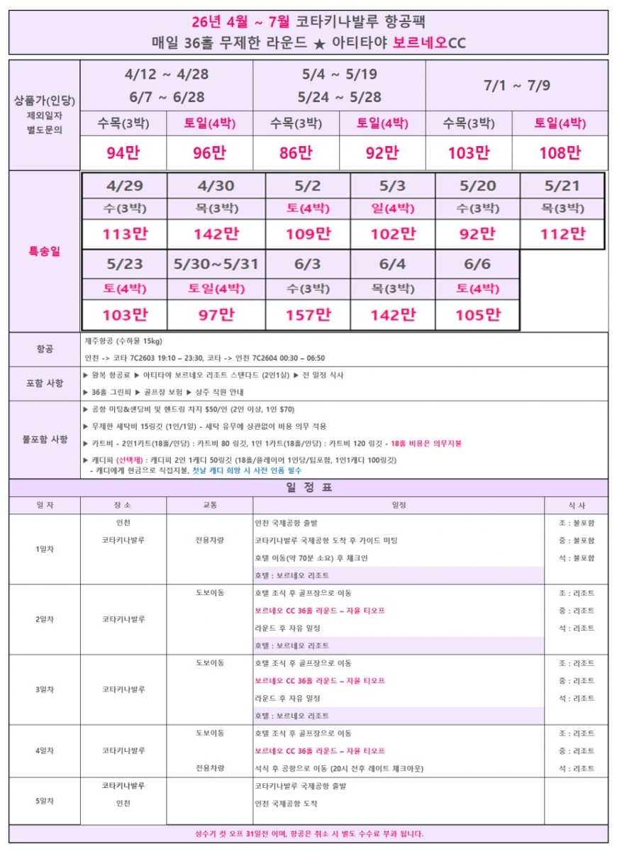 ·포함내역 왕복항공권, 리조트숙박, 전일정 식사, 그린피[36홀씩], 골프장보험, 관광세, 여행자보험