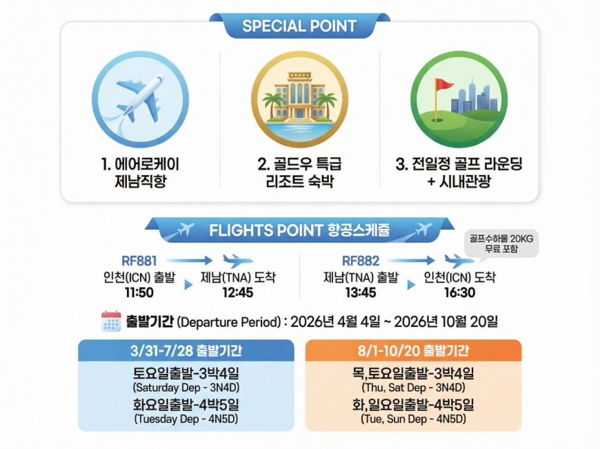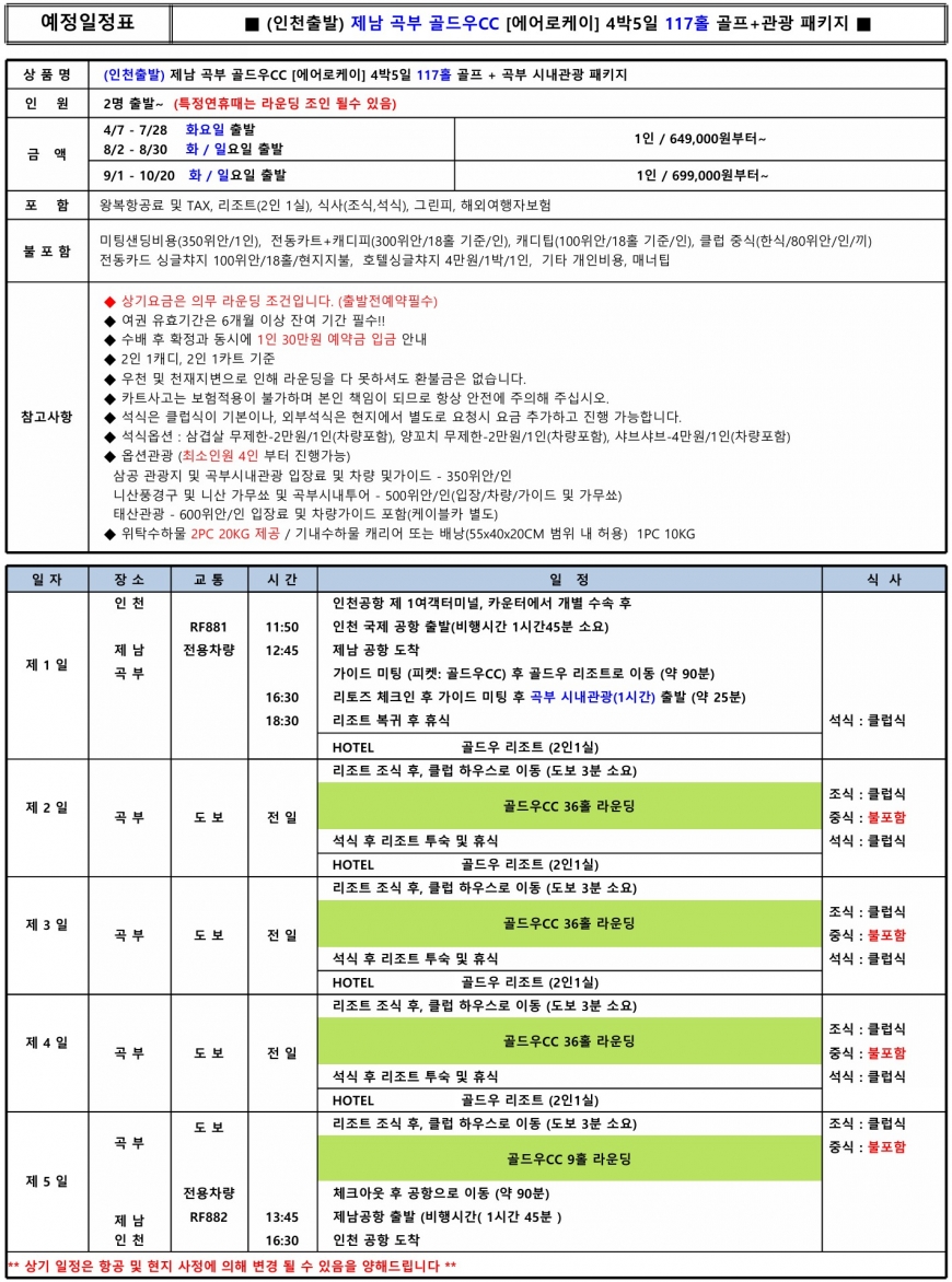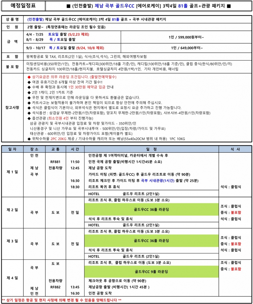 ·포함내역 왕복 항공권, 골드우리조트숙박(2인1실), 조식+석식, 그린피, 여행자보험