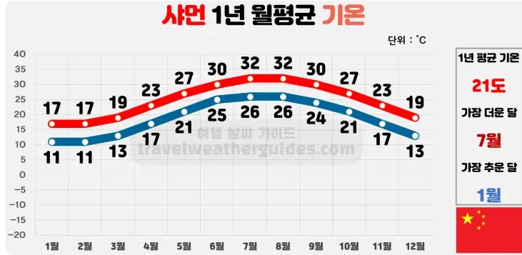 샤먼은 중국 7대 경제특구의 하나로 " 바다의 위의 정원" 이라고 불릴 만큼 깨끗하고 아름다운 항구 도시 입니다. 10월 ~ 4월은 우리나라의 봄, 가을 날씨와 비슷하며 여행하기 가장 좋은 날씨 입니다.